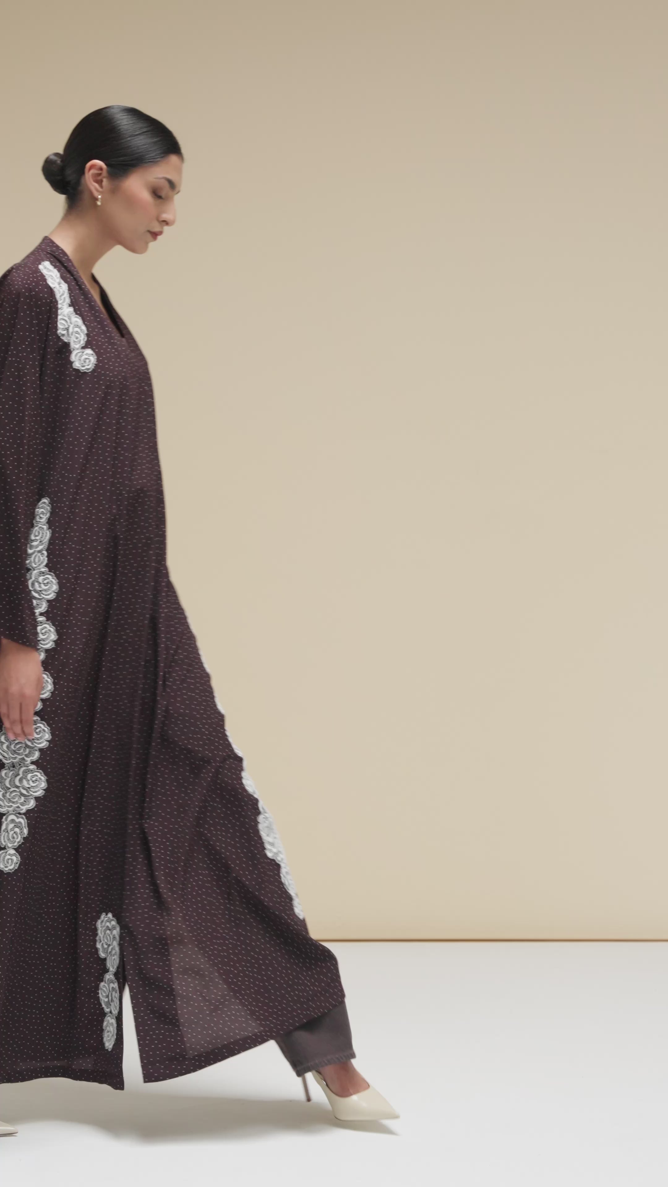 THIS ABAYA FEATURES A CLASSIC COMBINATION OF POLKA DOTS AND FLORAL LACE, IMPARTING A DISTINCTLY FEMININE ESSENCE. THE LACE FLORALS ARE ARRANGED ARTISTICALLY TO ACCENTUATE THE GARMENT'S FEMININE ATTRIBUTES.