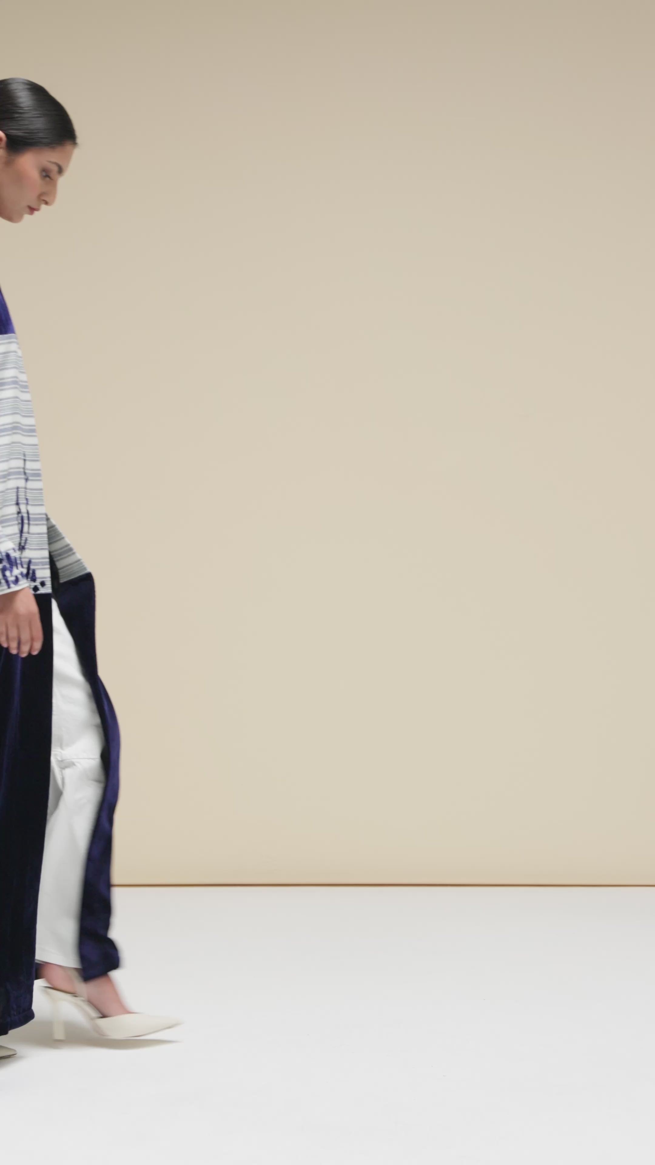 THIS EXQUISITE VELVET ABAYA IS A SIGNATURE PIECE FROM FOLD DESIGNER WEAR. IT FEATURES A STUNNING PANELING OF STRIPED LINED FABRIC, COMBINING LUXURIOUS TEXTURES OF VELVET AND LINEN. THE INTRICATE HANDWORK ON THE STRIPED FABRIC BEAUTIFULLY MERGES THESE TWO TEXTURAL CONCEPTS, CREATING A REFRESHING AND FUTURISTIC MOOD. THIS ABAYA TRULY REPRESENTS A CONTEMPORARY TAKE ON TRADITIONAL ELEGANCE.